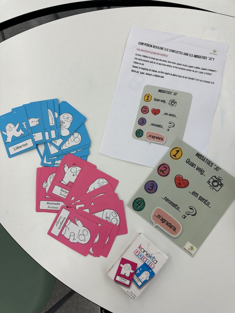 A les estones de cultura emocional durant aquest mes de maig, a tercer estem treballant la resolució de conflictes amb missatges “jo”. A partir d’exemples pràctics i amb l’ajuda d’una material que podreu veure a la següent fotografia, s’han treballat les emocions i les necessitats. A més, s’han visualitzat diversos curtmetratges a partir dels quals