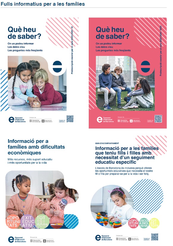 CONSULTA DE PORTES OBERTES DE LES ESCOLES: Abans del període de preinscripció, els centres organitzen trobades, visites i jornades de portes obertes perquè les famílies puguin conèixer el seu funcionament, els serveis que ofereixen i el projecte de centre o el caràcter propi de cadascun.
