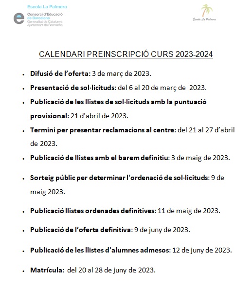 Famílies, un curs més, durant el mes de febrer s’inicia el procés de preinscripció a les escoles i els instituts. A continuació clicant INFORMACIÓ PREINSCRIPCIÓ tindreu detallat el procés que s’ha de realitzar. Us recomanem que aneu a la sessió informativa per poder resoldre els dubtes que us vagin surtin. En aquesta mateixa notícia, anirem afegint les informacions que el Consorci d’Educació vagi actualitzant. Així que us convidem que aneu entrant.