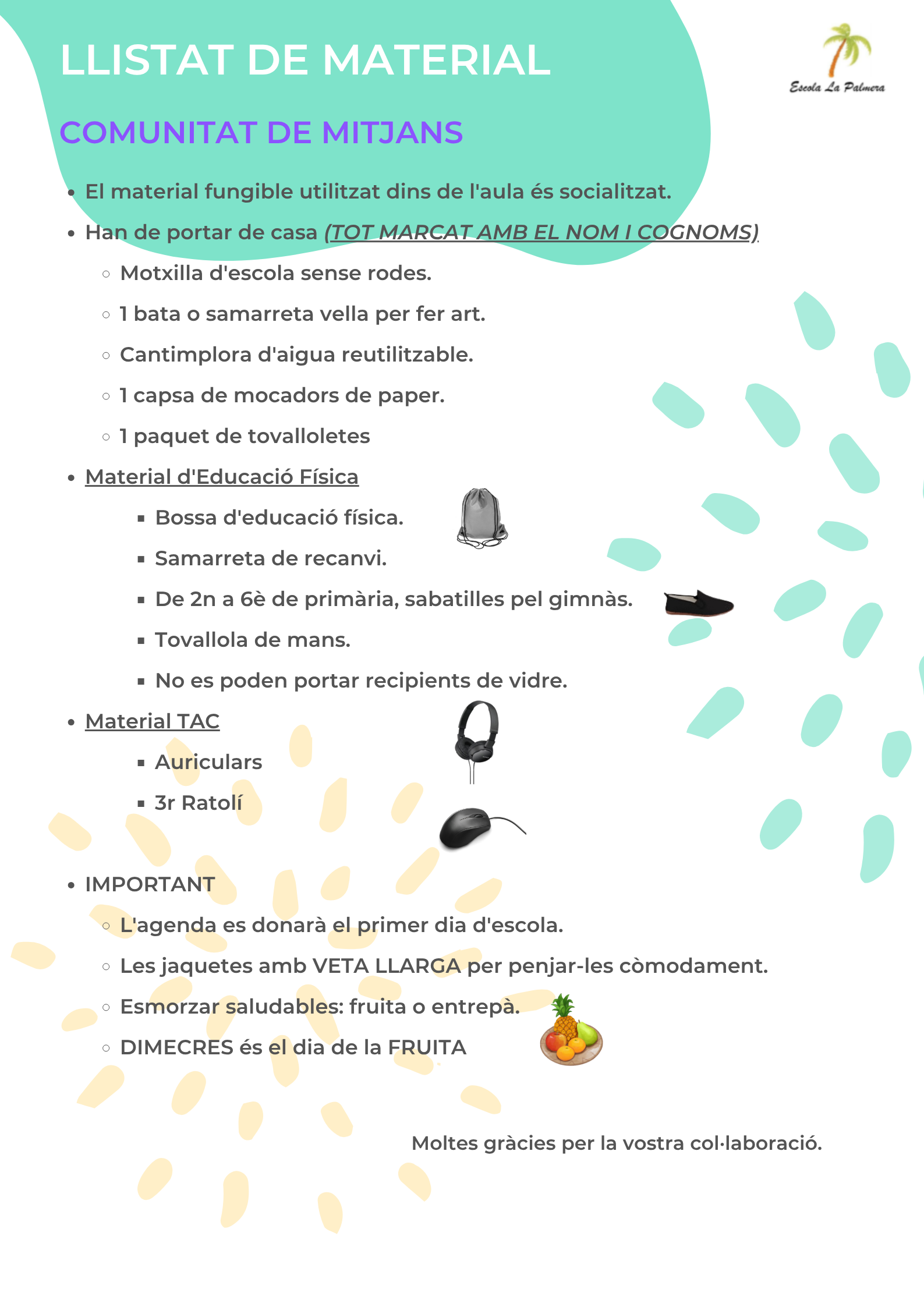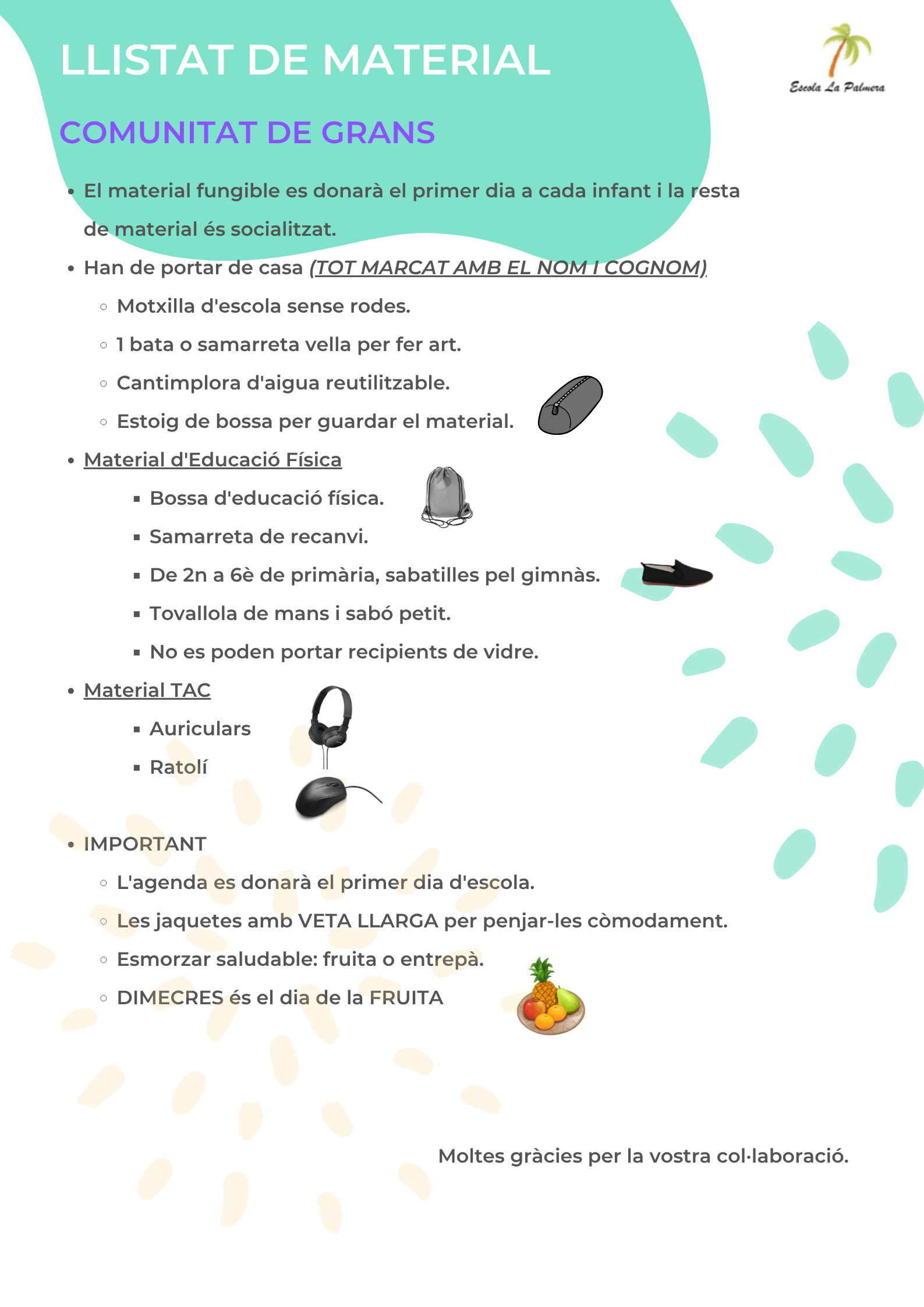 Segons acord de consell escolar, la quota actual que han d’abonar les famílies en concepte de material escolar i sortides és de 220€ anuals. L’escola ofereix la possibilitat de fraccionar aquest pagament en dues quotes. Clicant al full de la quota de material podreu accedir al document amb les instruccions per fer el pagament.