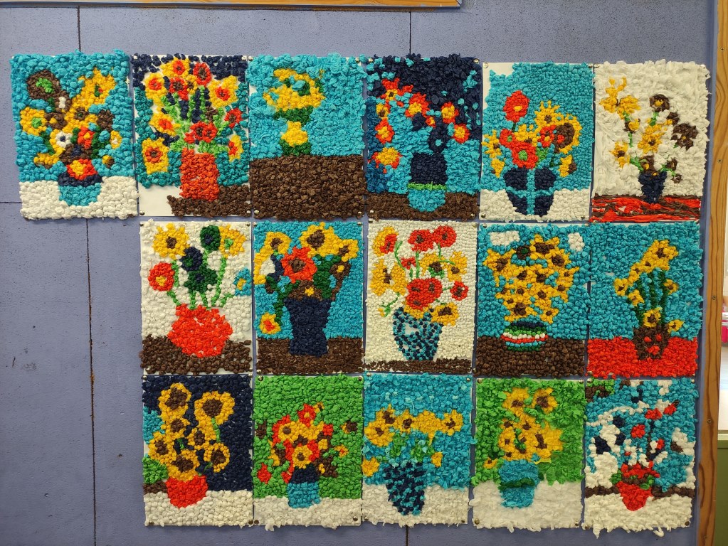 Aquest trimestre els nens i nenes de 5è hem estat treballant l’impressionisme a través de les obres de Van Gogh, entre altres tasques hem fet els seus girasols i també un mural col·laboratiu de La nit estelada.