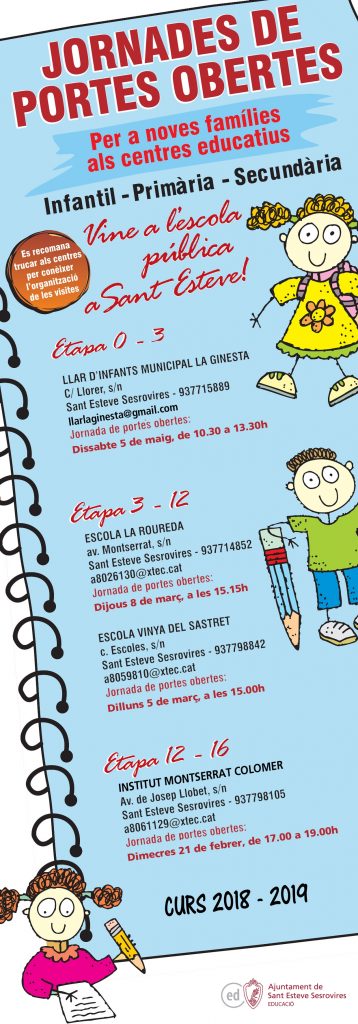 Us Informem de les dates en que es realitzaran les colònies dels diferents cicles a l’escola: Educació Infantil: 21, 22 i 23 de març. Cicle Inicial: 2, 3 i 4 de maig Cicle Mitjà: 30, 31 de maig i 1 de juny Cicle Superior: 14, 15 i 16 de maig.