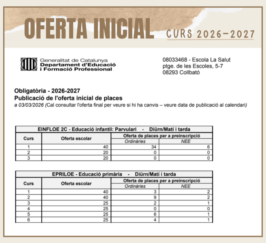 Dates preinscripció: Segon cicle d’Educació Infantil (3-6 anys) i Educació Primària: del 4 al 18 de març