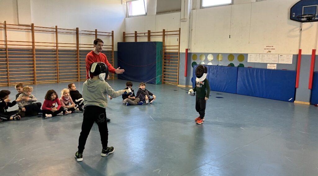 A l’escola, l’alumnat de primer, vam fer una taller d’esgrima. Ens van explicar quines són les normes i vam practicar-ho.