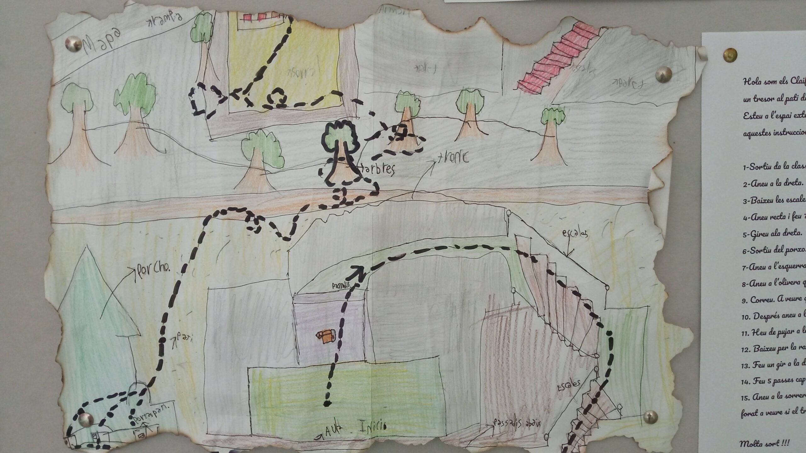 Hola som els Claifers. Hem amagat un☺tresor sota l’armari de pales i galledes de la sorrera del pati de baix. El meu equip som la’Aina l’ Ulises, la  Paula i jo l’ Ian.