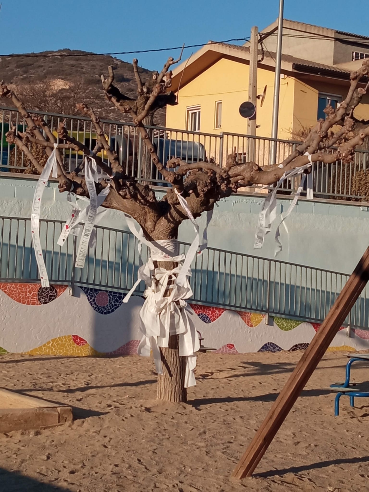 En uns retalls de bossa de basura blanca vam escriure les frases amb rotuladors permanents de colors i les vam penjar a l’arbre de la Pau al pati.