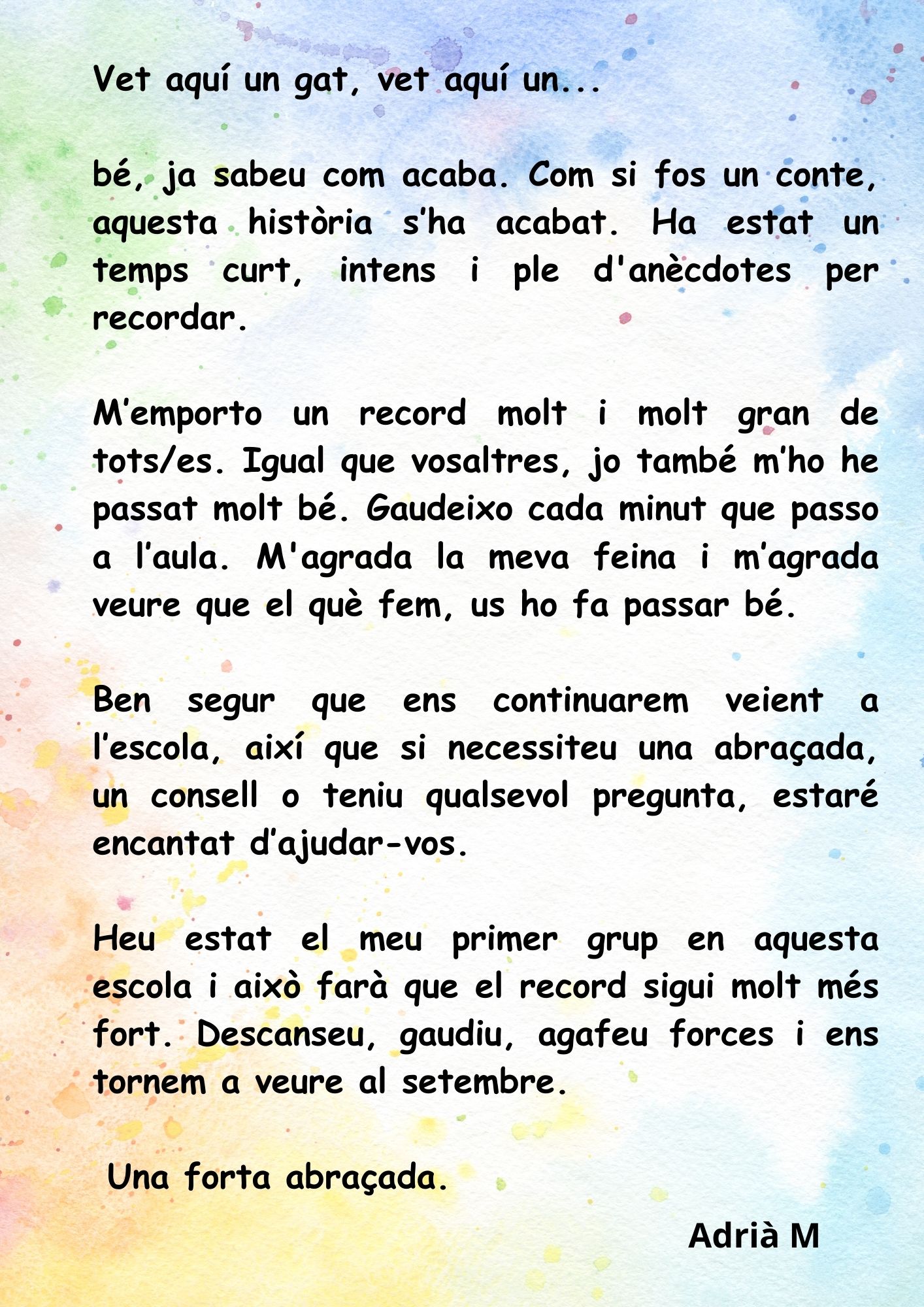 28/06/24Bon dia, us escric per tal d’acomiadar-me, dir-vos que aquest curs ha estat un plaer tenir-vos com a alumnes i que tots junts hem après moltes coses.