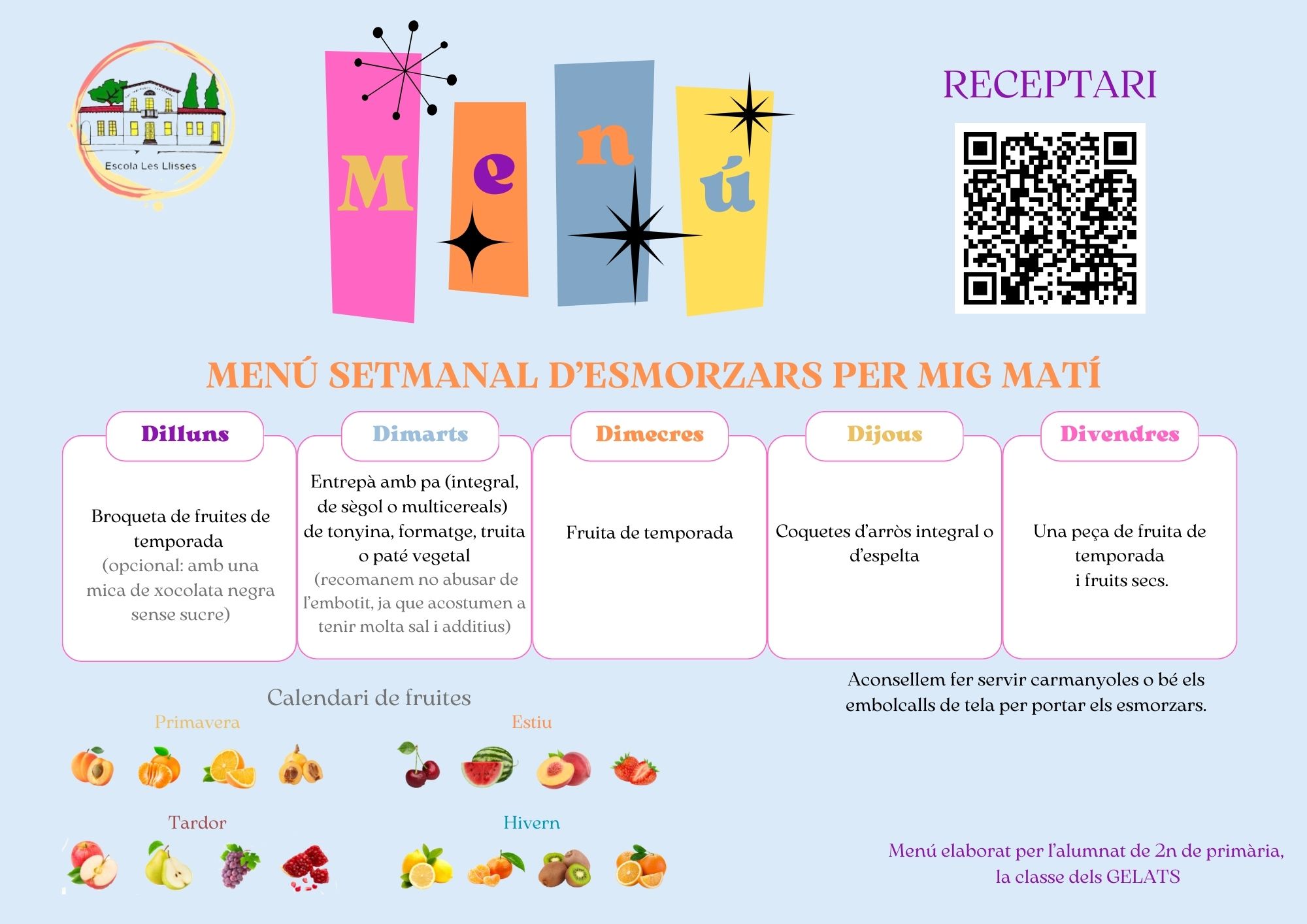 Aquest menú li hem donat a cada classe i també a la Cristina, que ens va venir a veure a l’escola! Esperem que sigui de gran ajuda!