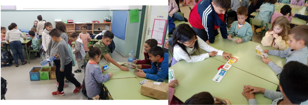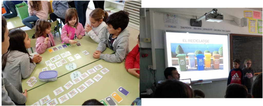 Els alumnes de 4t ensenyen com funciona el reciclatge als alumnes d’Educació Infantil. Els expliquen quines accions cal fer per tenir un medi sostenible i els acompanyen a buidar les papereres de l’aula als contenidors que corresponen.