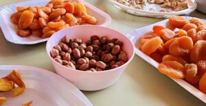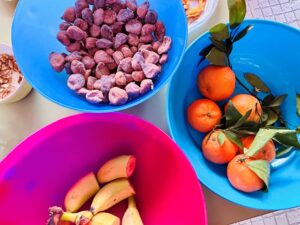 Els nens i les nenes de l’escola, acompanyats de les seves famílies van menjar mandarines, plàtans i molta varietat de fruits secs.