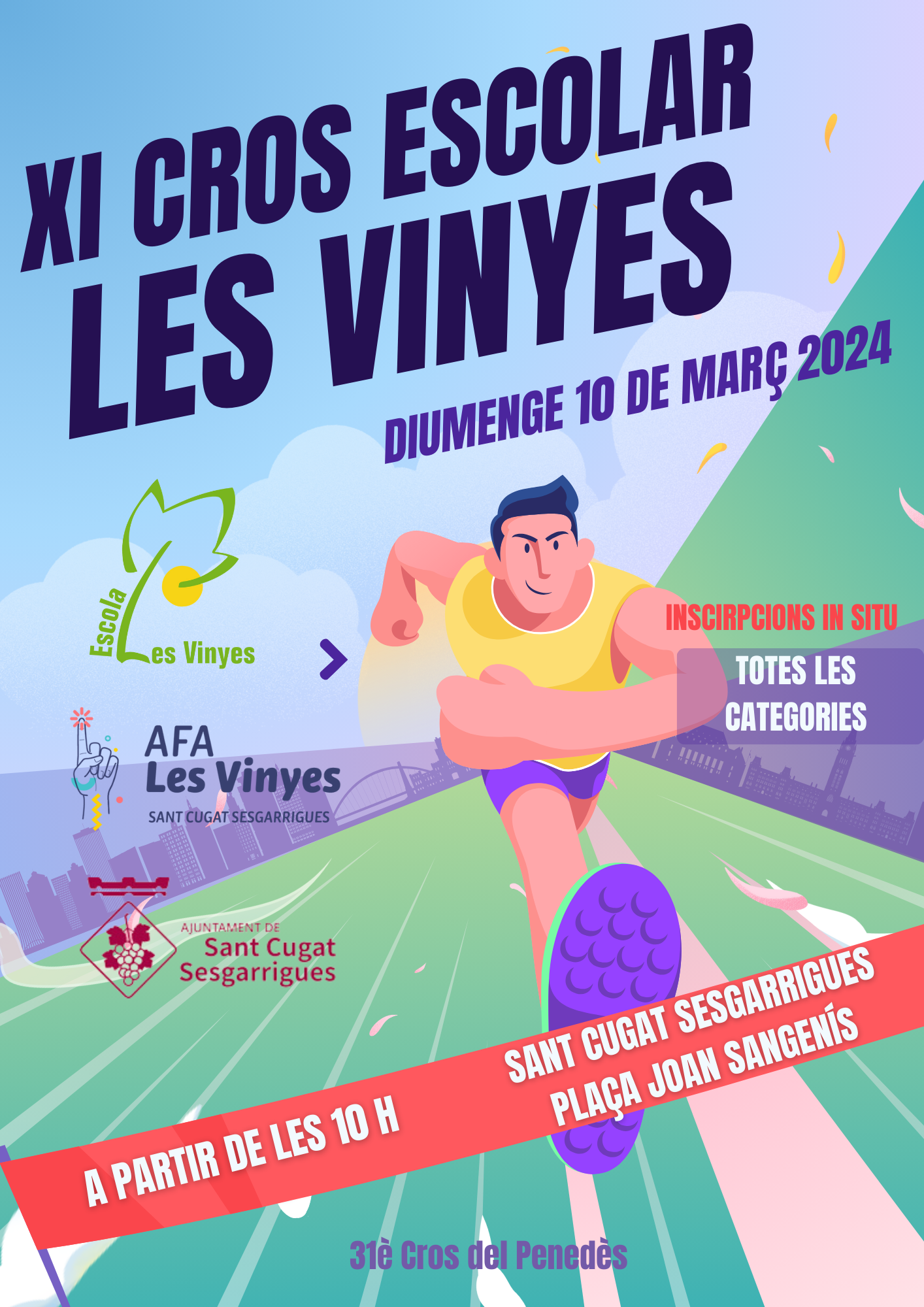 Ens fa especial il·lusió anunciar-vos que després d’uns quants anys de l’últim Cros Escolar, des de l’Escola Les Vinyes i la seva associació de famílies (AFA) es recupera aquesta cursa popular pels infants i per tothom que hi vulgui participar. Aquest, serà el diumenge 10 de març a partir de les 10 de matí a la Plaça Joan Sangenís. Us hi esperem a tots i totes!