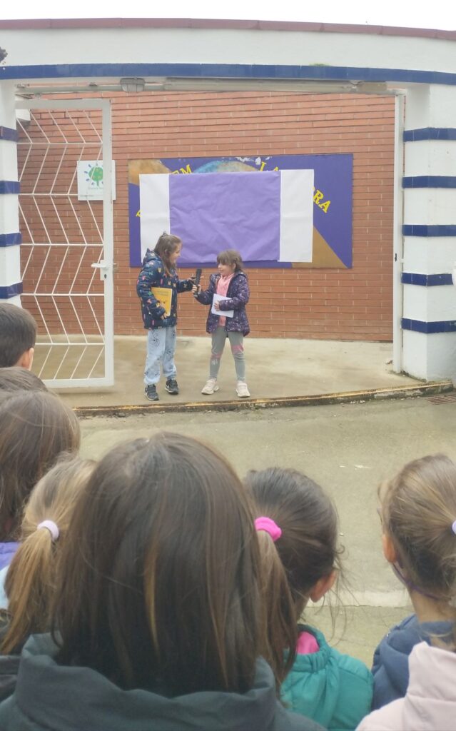 Aquest matí hem celebrat el 8M a l’escola. Tots els nens i les nenes de primària ens hem trobat a l’entrada de l’escola per explicar com ho hem treballat a classe durant aquesta setmana.