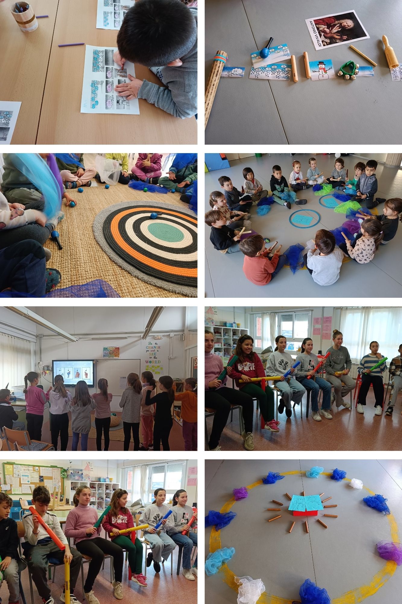 Els més petits ens hem convertit en personatges de l’hivern, hem ballat i hem acompanyat les diferents parts de l’obra amb instruments de petita percussió i parts del cos, convertint-nos posteriorment en una gran orquestra per acompanyar la música. A més, també hem representat el paisatge de l’hivern mentre escoltàvem la peça.