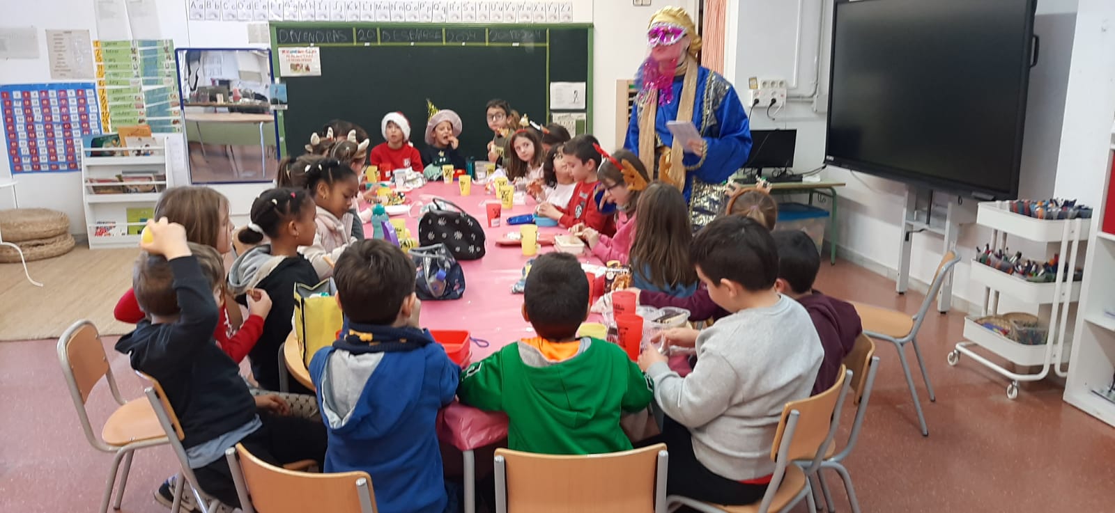 A l’hora d’esmorzar hem pogut menjar neules i torró de xocolata acompanyat per sucs i Cacaolat. En acabat hem aprofitat per jugar, veure una pel·lícula, canta o ballar. Ha estat un dia ben especial.