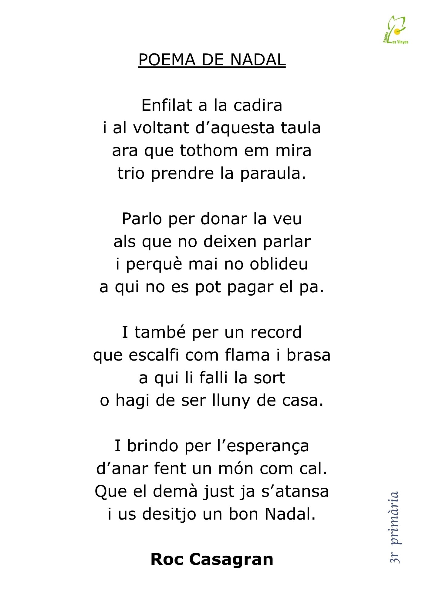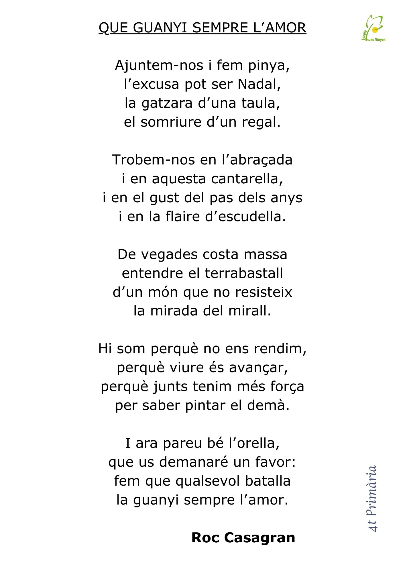 Ja tenim aquí el final de trimestre que ens porta a les festes plenes de trobades, àpats i moments entranyables per viure plegats. Així doncs, com és tradició, és el moment de trobar-nos tots a l’escola, per gaudir del recital de poemes i de la cançó conjunta que hem preparat amb molta il·lusió. Tot seguit, podreu descobrir els textos per si els voleu anar seguint. Ah! I si us animeu a cantar amb nosaltres no patiu, tancant l’entrada hi ha la lletra de la cançó de final de festa per fer un bon cor de veus de tota la comunitat educativa. Esperem passar una càlida tarda plegats. Bones festes!