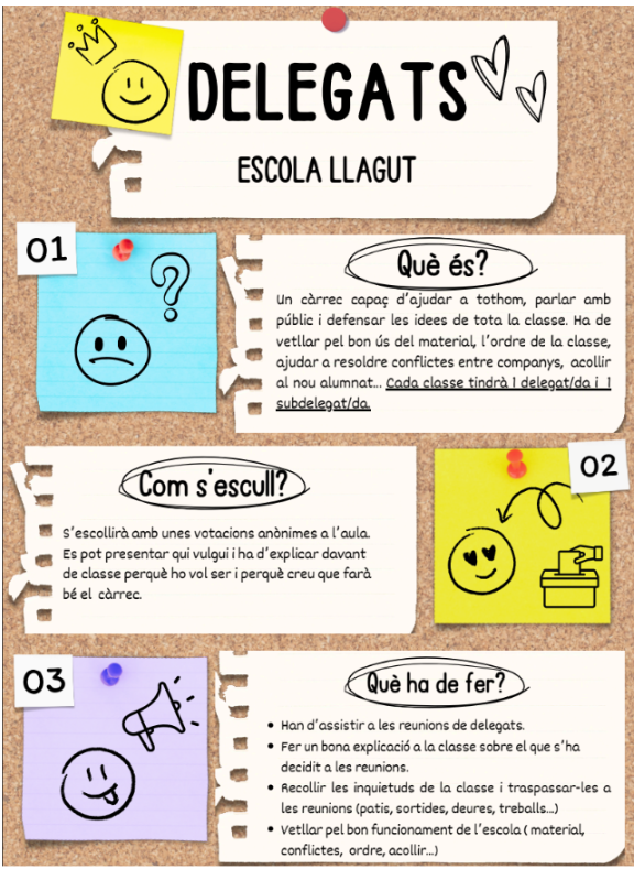 ● Procés d’eleccions no obligatori. Votacions anònimes a l’aula. El procés el determina el tutor/a (eslògans, cartells, canva, treball d’expressió oral…)