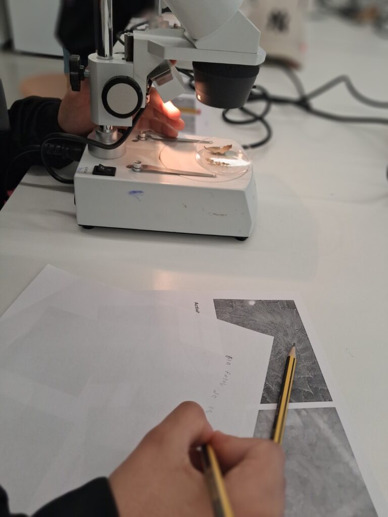 Quan vam entrar hi havia dos professors que ens van guiar durant tota la visita. Vam entrar a la classe de plàstica i ens van ensenyar com feien la plàstica a l’IES. Després vam entrar a la classe de ciències on vam fer un experiment on havíem de mirar per un microscopi. Després vam anar a la classe de música i ens van fer una exhibició amb ukelele. Per últim, vam anar al pati per parlar amb els nois i noies de l’institut.