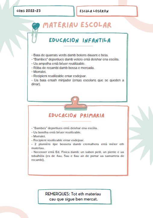 Materiau inici de cors admin29/08/22 Bon dia, Aciu vos deisham un listrat deth materiau que cau portar eth prumèr dia de cors. Rebrembatz qu’era rèsta deth materiau ja ei ena escòla, era AFA ja mos lo a cromprat.