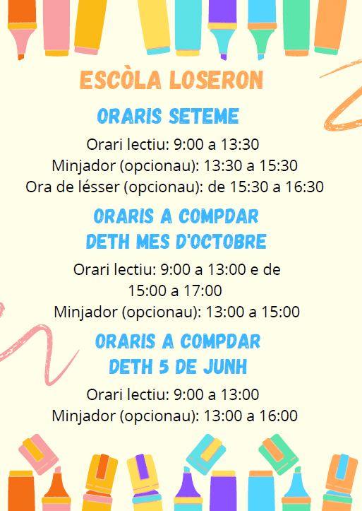 Oraris deth cors 22-23 admin29/08/22 Bon dia, Vos deisham un resumit des oraris d’aguest cors, damb es naues modificacions.