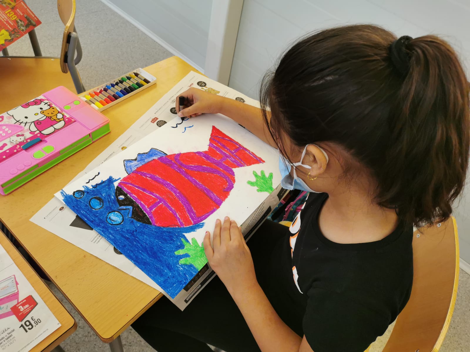 A 3r estem realitzant uns peixos marins molt diferents i especials. Cadascú de nosaltres hem dibuixat un peix amb el nostre nom  i després l’hem pintat amb ceres. Ens hi hem esforçat molt i segur que quan els pengem pels passadissos quedaran molt bonics. Esperem que us adgradin! 😉