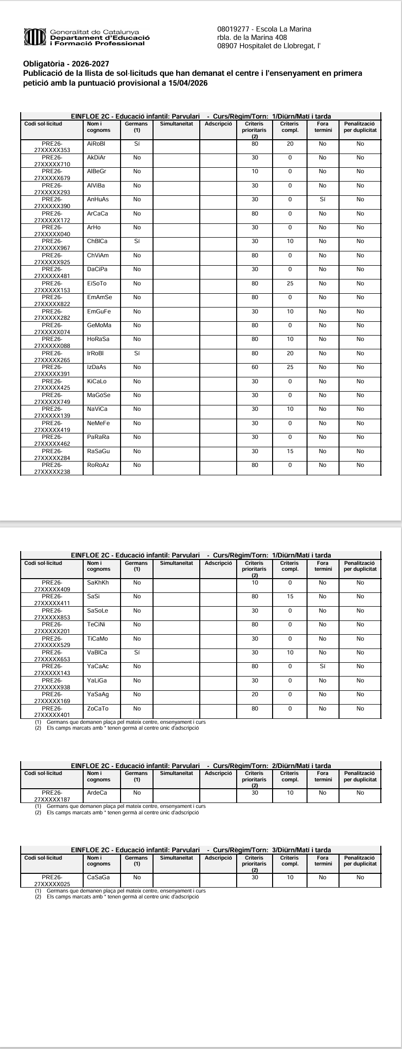 Aquí teniu la puntuació provisional publicada avui 15/04/2026 i l’oferta de places.