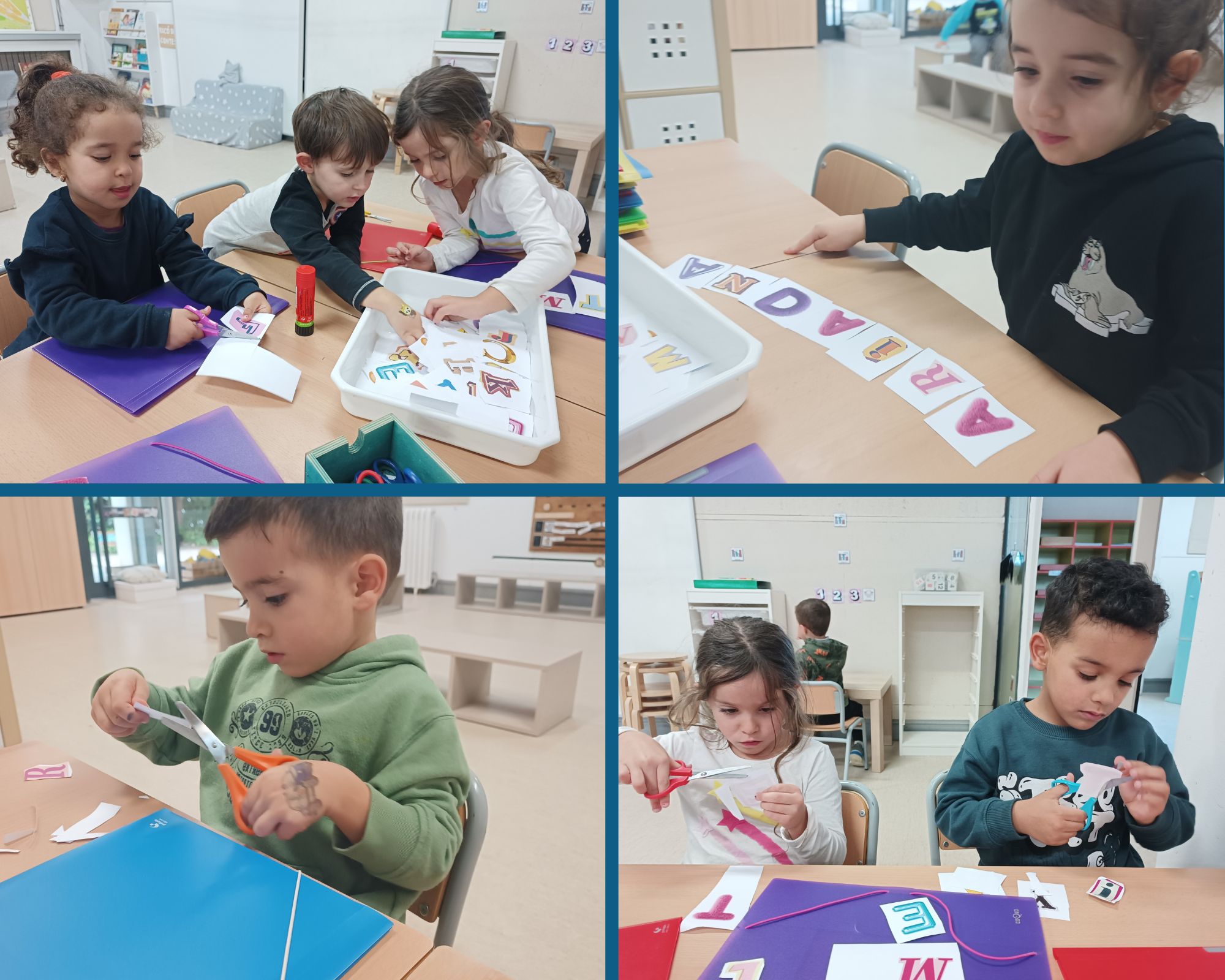Per no perdre les carpetes, posem el nostre nom, fent servir lletres divertides que cal que busquem dins una safata, les endrecem per odre, les retallem i les enganxem. Sembla una tasca fàcil, però molts Pinotxos han suat una miqueta per trobar totes les lletres i posar-les en l’ordre adequat.