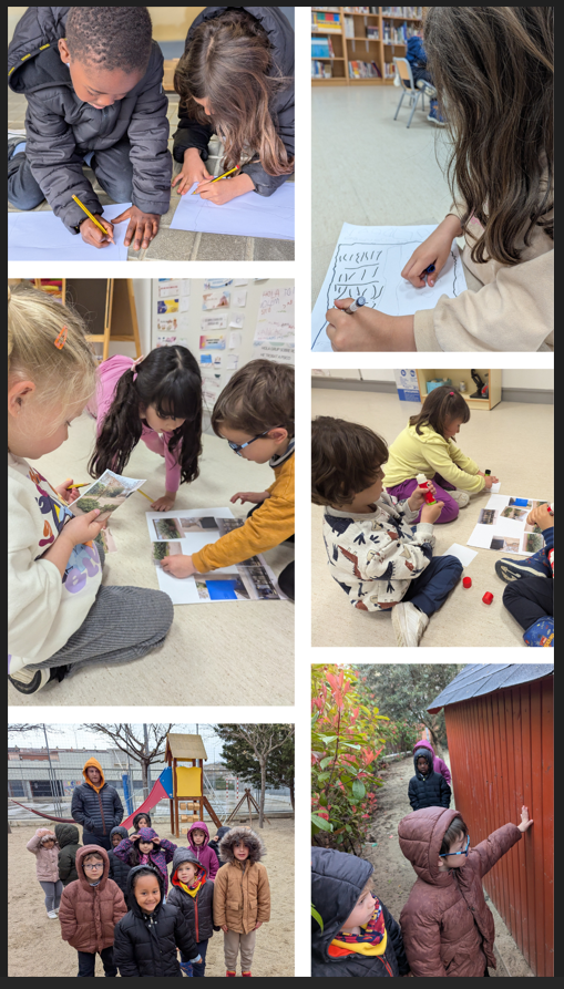 Els SobreRodes vam anar a observar els diferents espais per situar el nostre rocòdrom i vam observar que el pati de petits té les parets molt plenes, així que vam decidir que el millor lloc per fer-lo era a la nostra terrasseta; la paret de la terrasseta que més ens va agradar va ser la paret blava de costat de Tabalugues. Malgrat el temps que feia (plovia una miqueta) els Sobrerodes vam decidir plasmar en un paper la situació d’aquesta paret dins la terrasseta i ens va ser força complicat de dibuixar. Com que a través dels nostres dibuixos no quedava gaire clar ens vam ajuntar en grups de 3 infants i amb l’ajuda d’unes fotografies vam fer la distribució dels diferents elements i parets de la nostra terrasseta i marcar, ara sí, la paret blava.