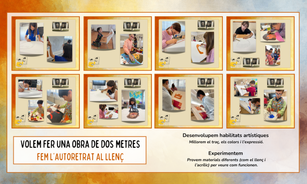 També hem experimentat amb diferents tècniques, com ara barrejar colors i fer degradats, i, per acabar de donar vida als nostres autoretrats, hem resseguit els contorns i els detalls amb retoladors Posca, perquè són acrílics. Aquest toc final ha afegit definició als nostres llenços, fent que cada obra sigui única.
