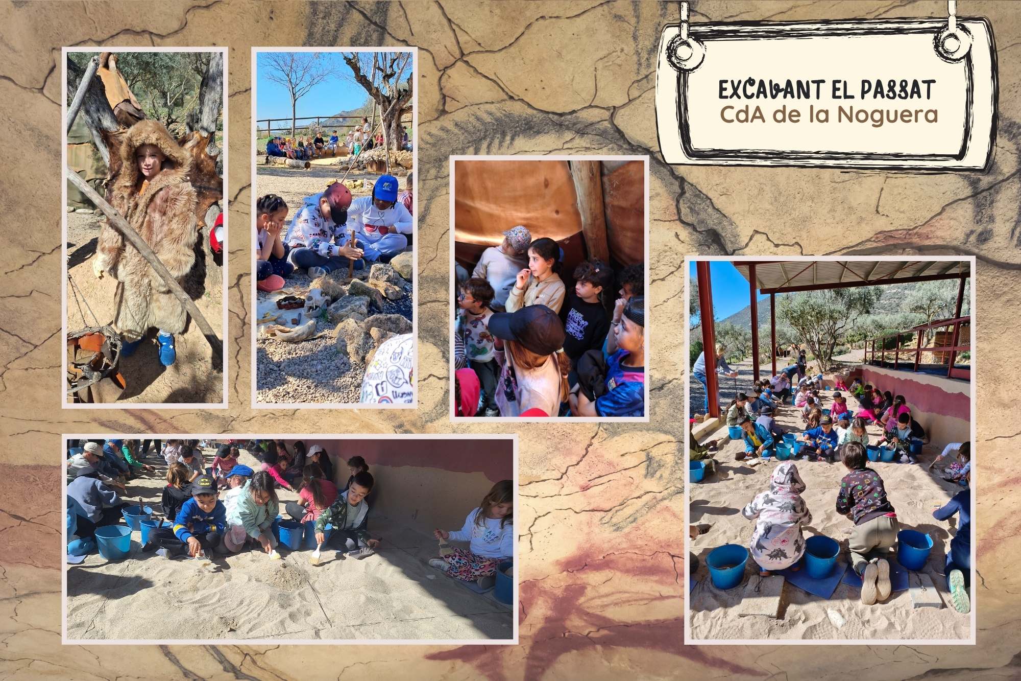 “Al camp d’aprenentatge de La Noguera vam excavar el passat. Ens van ensenya el valor de excava amb cura i paciència per no trencar les coses del passat i cuidarles. Vam trobar sílex, ossos d’animals i d’humans, pinzells, instruments, petxines i fòssils. Teníem eines per excavar. Un cubell, una pala, una catifa i un pinzell. I després ens van donar una carpeta amb un llapis per dibuixa i escriure el que haviam trobat.” Documentat Chloe i Ainara.