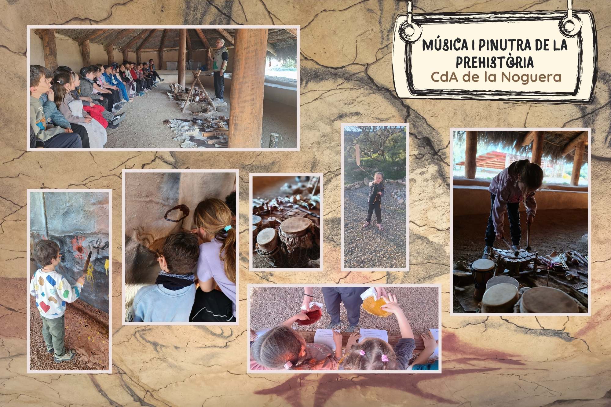 “Vam fer un taller al campament arqueològic per conèixer la música de la prehistòria. Ens van explicar que feien servir tots els materials de la natura com canyes, ossos d’animals, petxines, pells d’animals, troncs, pals, cordes, banyes i dents d’animals… la música servia per fer les seves festes, per reunirse al voltant del foc. També ens van explicar l’art. Els colors que feien servir eren el vermell, el groc, el negre i el marró. Les eines que utilitzaven per pintar eren els dits, els pinzells que estaban fets de canyes i pels de cavall.” Documentat per Aleix, Gala i Axel Muñoz.