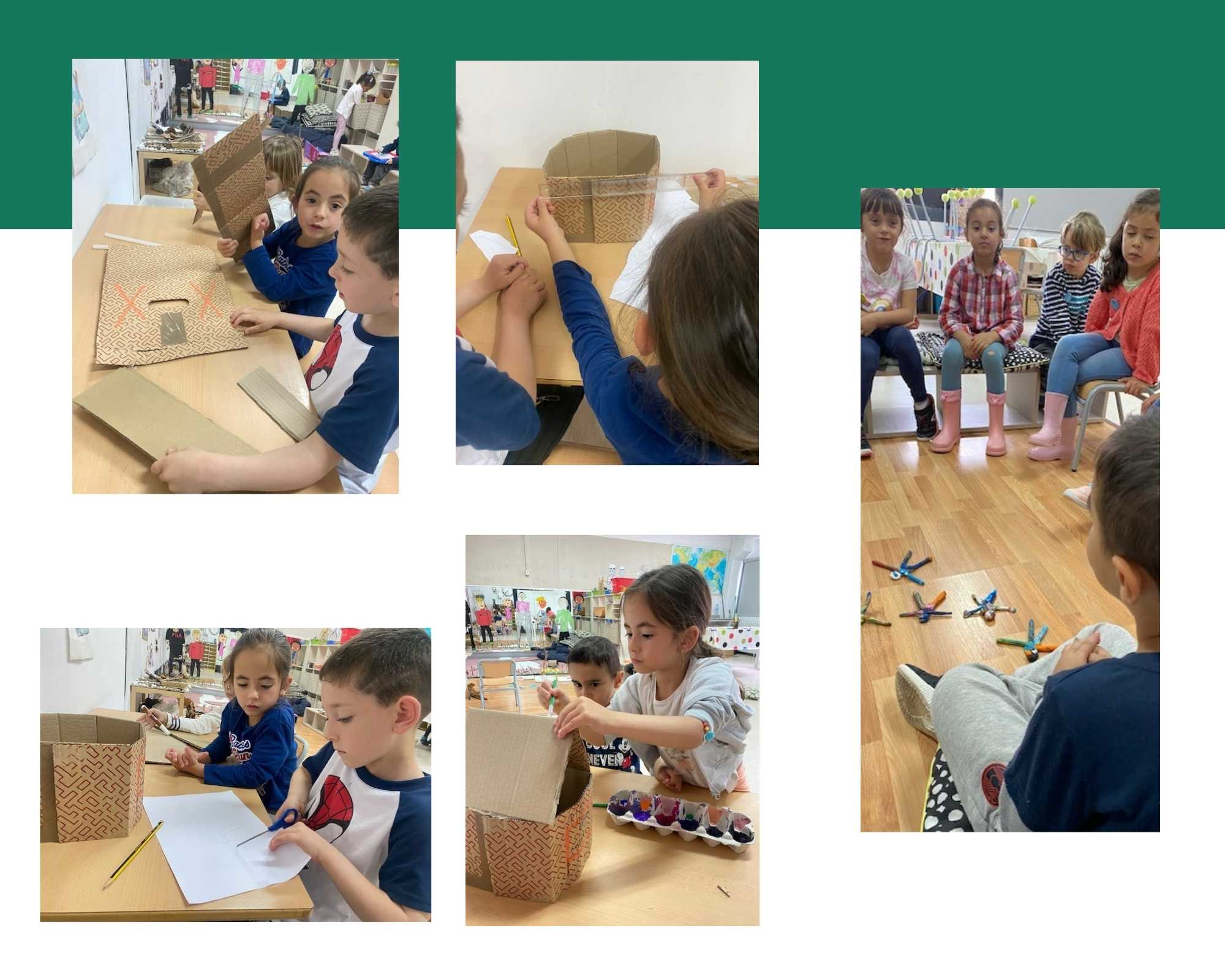 Només ens queda la caseta. Aquesta última setmana hem estat mesurant i provant materials per crear la caseta del pati. Analitzem l’esbòs que vam fer amb paper, i reflexionem com fer-ho. Provem dos materials que tenim a l’aula: cartró i paper. Hem de refer vàries vegades el que tenim pensat perquè al fer la comprovació no queda com volíem.