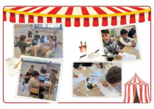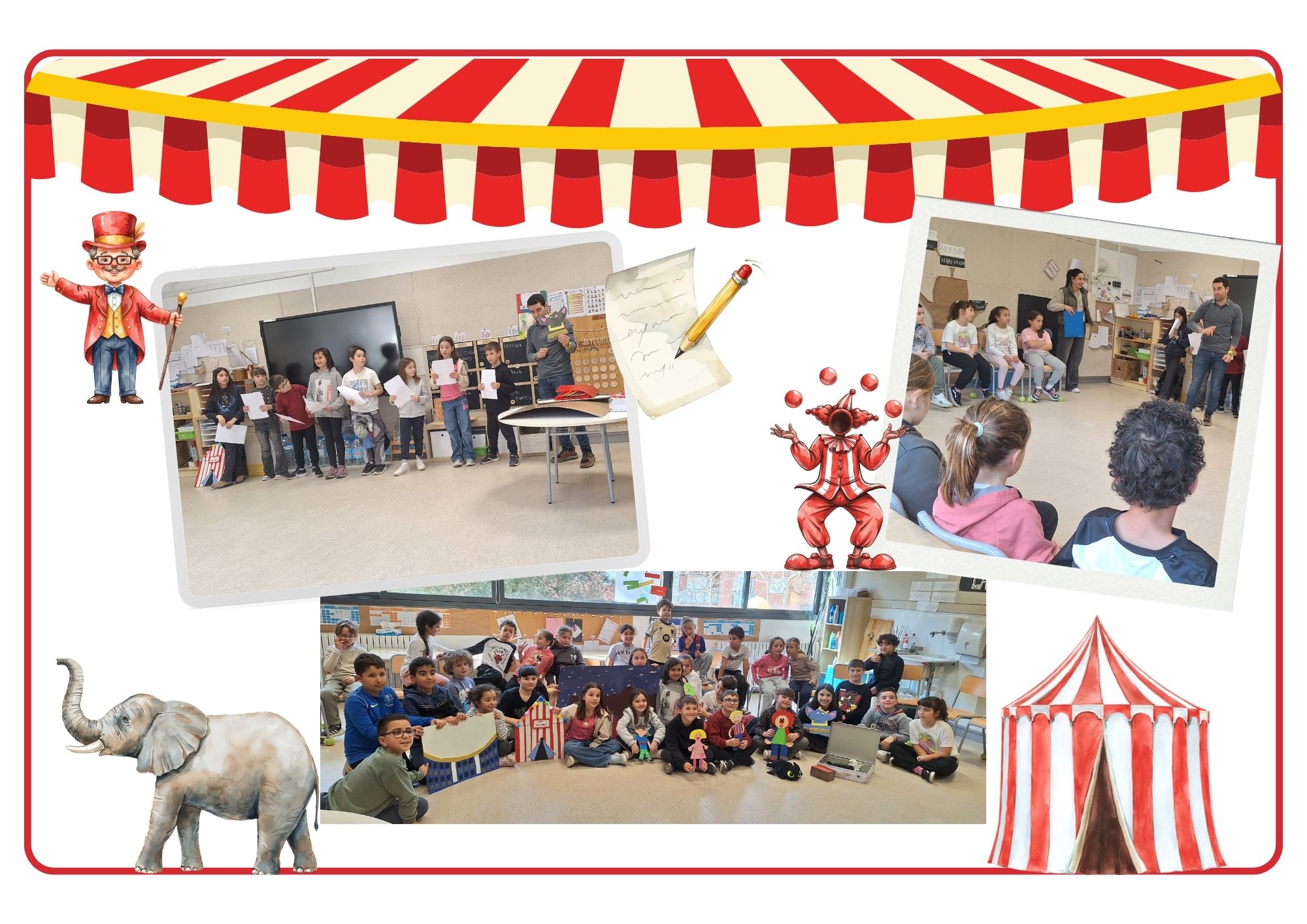 Abans de marxar, també ens van ensenyar els elements creats per fer les il·lustracions. Ens van presentar els personatges principals, així com l’escenari: el circ Mafamà! En acabar la seva exposició, ens vam fer una foto plegats i es van acomiadar després de passar-nos el relleu.