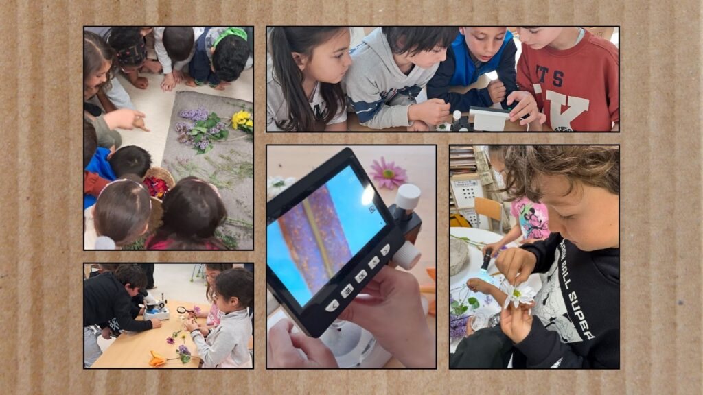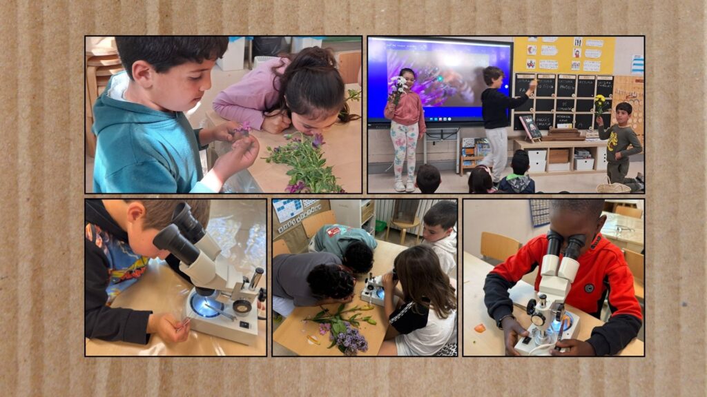 Però no ens vam quedar aquí. Amb l’ajuda de lupes i microscopis, vam poder fer un pas més enllà i observar detalls que a simple vista passen desapercebuts. El pol·len, ampliat, es transformava en petites estructures sorprenents, diferents segons la flor observada. Aquesta experiència ens va permetre adonar-nos de la riquesa i diversitat del món vegetal.