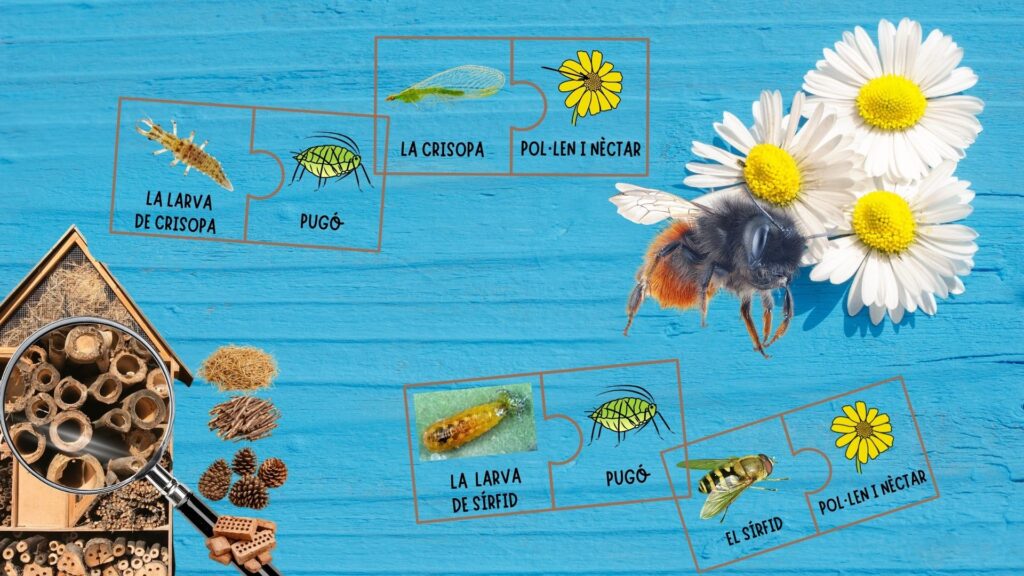 En primer lloc, vam conèixer la crisopa i el sírfid, dos invertebrats que ens van sorprendre per la seva doble funció dins la natura. D’una banda, quan es troben en fase de larva, esdevenen grans devoradors de pugó, fet que els converteix en aliats molt importants per al control de plagues. D’altra banda, quan arriben a l’edat adulta, s’alimenten del pol·len i el nèctar de les flors, contribuint així a la pol·linització. Aquesta doble funció ens va ajudar a entendre millor la importància de la fauna auxiliar i el seu paper en l’equilibri dels ecosistemes. Així doncs, vam tenir molt clar que també volíem afavorir la presència d’aquests insectes al nostre hotel.