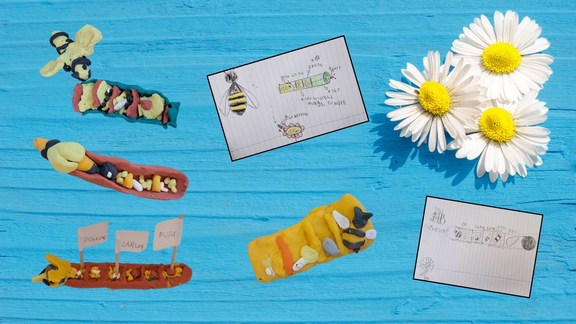 Per tal de documentar aquest procés, vam utilitzar diferents formes de representació. Alguns infants van optar pel dibuix, mentre que d’altres van decidir modelar amb plastilina les diferents fases del cicle vital. Gràcies a aquest treball, vam poder afirmar amb seguretat que, de les canyes tapades amb fang del nostre hotel, en sortiran abelles quan arribi la primavera.