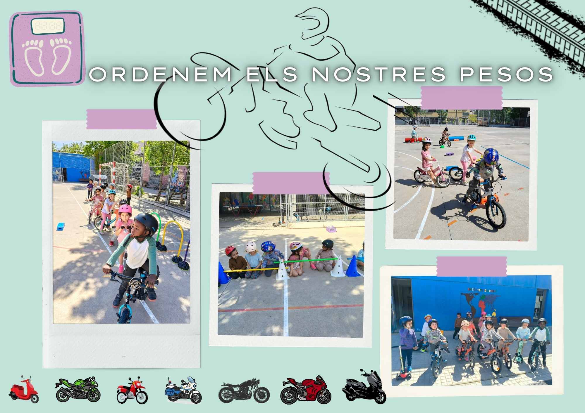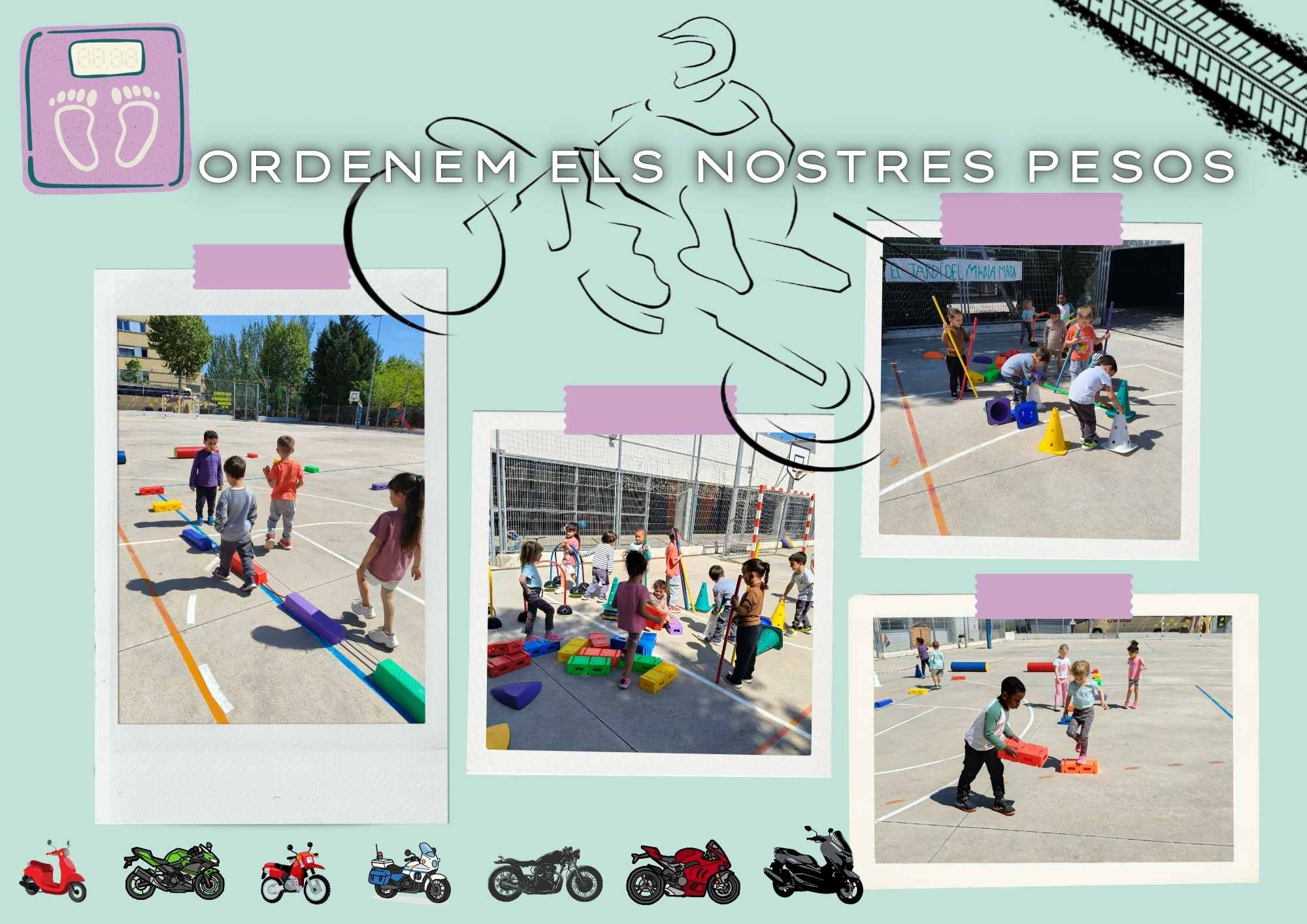 Després hem planificat l’espai. On van els espectadors? Posem tanques per observar l’exhibició sense perill. On va el circuit? Quines peces podem col·locar per saltar-les, com si fossin obstacles de trial. Un cop muntat el circuit, hem anat a buscar les nostres bicis i patinets. Ens hem posat els cascs i hem anat a provar el recorregut.