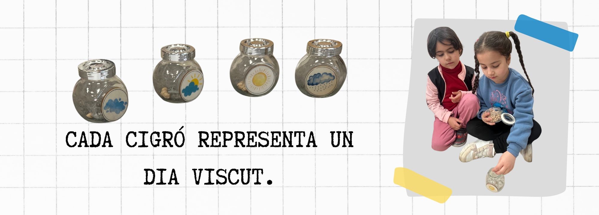 Cada dia, després del pati, ens aturem un moment per mirar el cel. Observem si fa sol, si hi ha núvols o si plou. En parlem entre tots i ens posem d’acord sobre quin tipus de temps ha fet. Quan ho tenim clar, un Rovelló col·loca un cigró dins del pot corresponent.