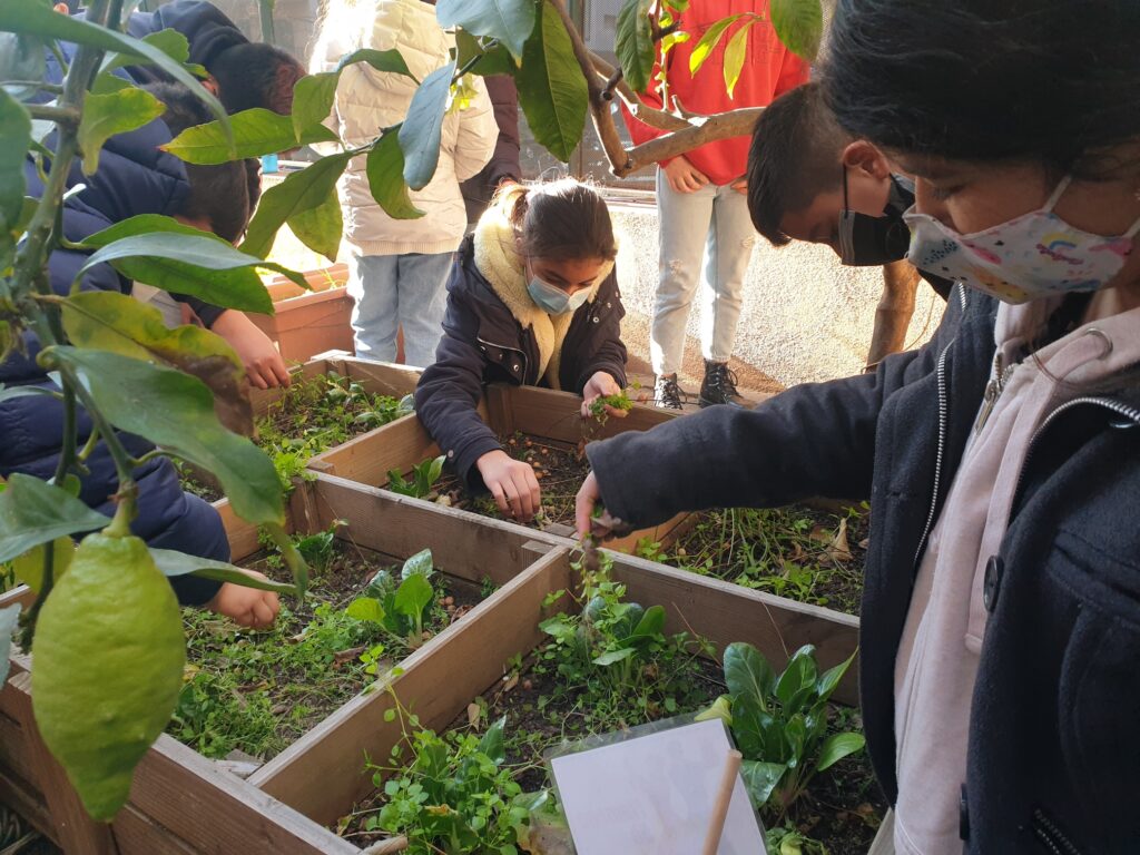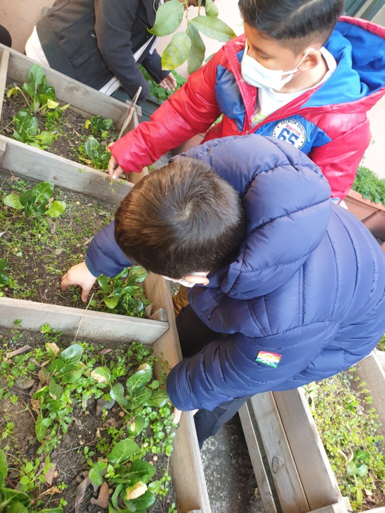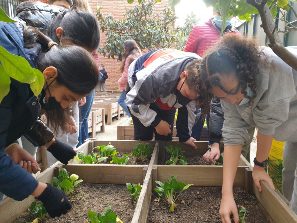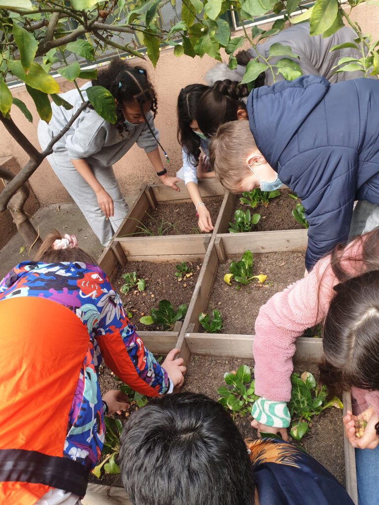 Els nens i nenes de la classe de 5è baixem cada setmana a tenir cura del nostre hort. Vam plantar fa uns mesos bledes i alls i anem veient i observant com van creixent a poc a poc.