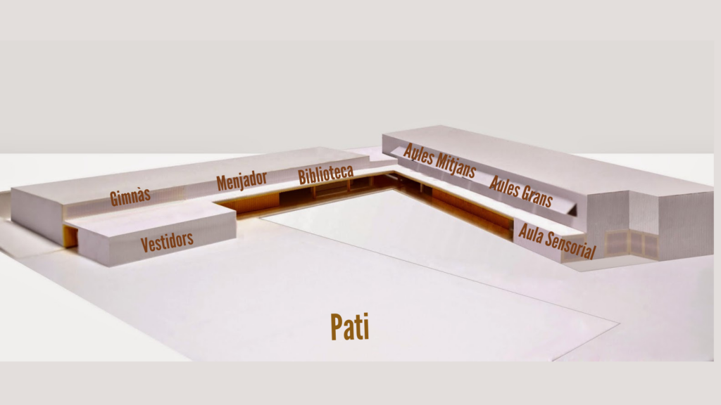Al pis de baix trobem les aules d’infantil, art, música, sala sensorial, sala de ràdio, lavabos i sala de material a un costat i a l’altre, els despatxos, la biblioteca, el menjador i el gimnàs.