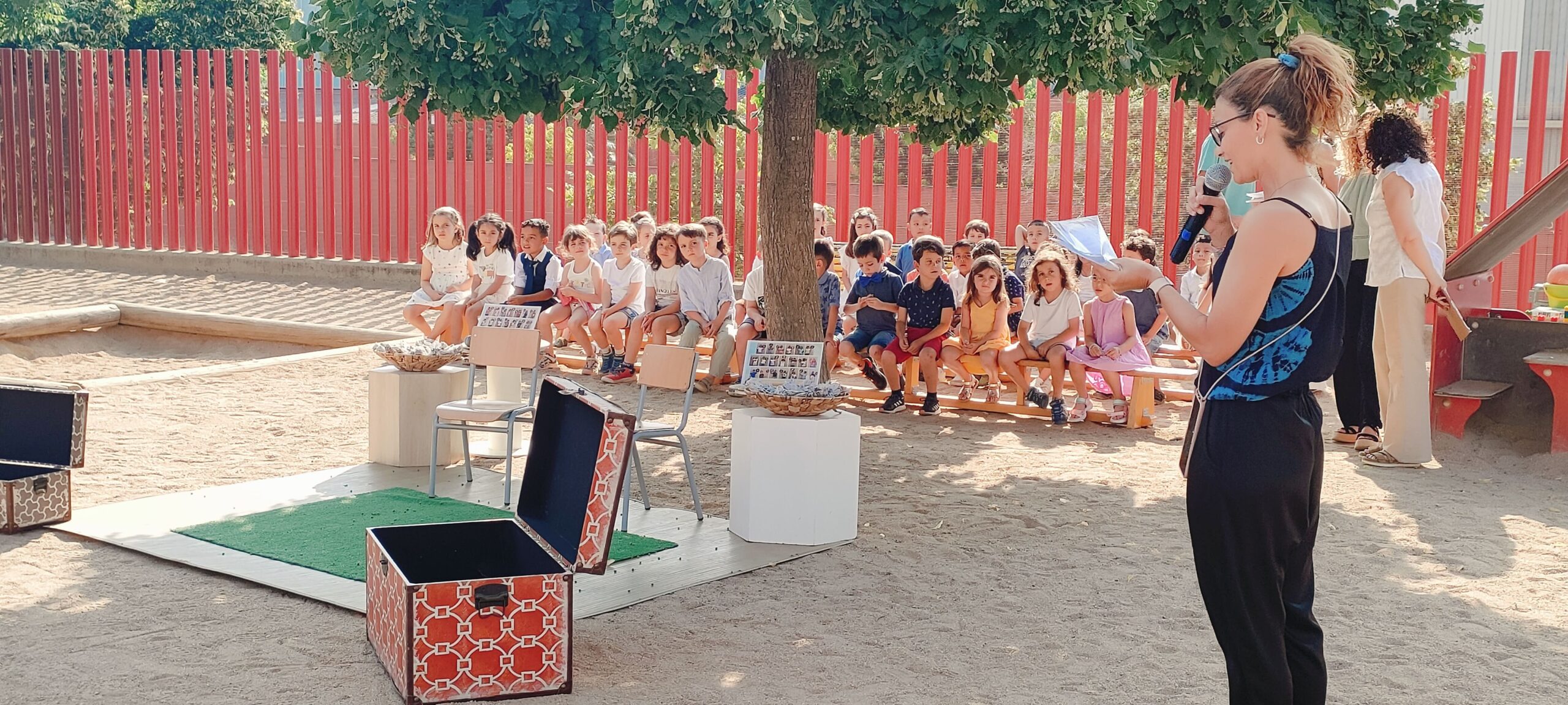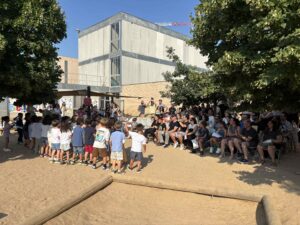 La festa va començar amb una càlida benvinguda a totes les famílies, que van omplir el pati d’il·lusió i somriures. Tot seguit, els infants van protagonitzar un dels moments més emotius del dia: van dipositar dins d’un cofre aquells objectes significatius que volen endur-se d’I5 a Primer, com a record d’un any ple d’aprenentatges i vivències.