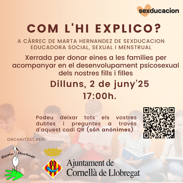 L’AFI de l’Escola Martinet, des de la Comissió de Co-educació, presenta la 1a xerrada del curs, destinada a famílies de l’alumnat d’infantil i primària -cicle inicial i mitjà-, per parlar d’educació sexual i afectiva. Tindrà lloc el proper DILLUNS 2 DE JUNY DE 2025 de 17 a 19:00 HORES. La xerrada serà:
