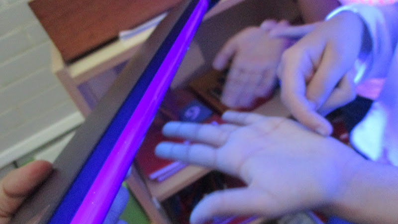 At Martinet school all students are learning the difficulties of getting rid of germs, specially on our hands. For that reason wehave watched some videos in order to learn to follow the right way and after washing our hands we check if they are real clean using a ultraviolet light he have just got in