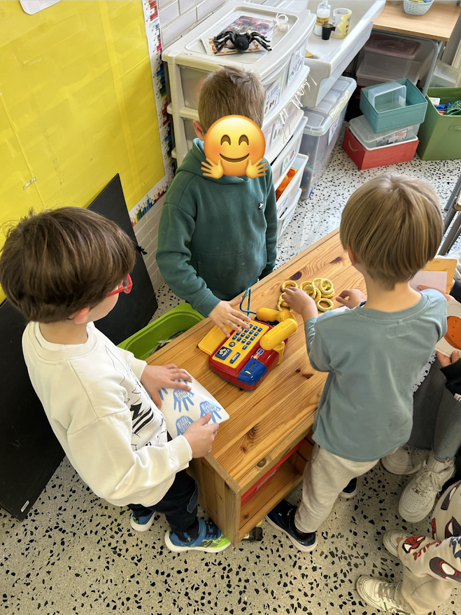 En l’activitat “At the market” l’alumnat simula que són botiguers i clients al mercat. Practiquem algunes estructures com “Do you have 5 oranges?” “Yes, I do”, per exemple. Fem un joc simbòlic amb joguines de diferents tipus de menjar.