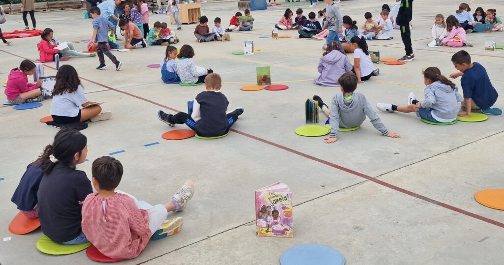 Aquest curs per celebrar Sant Jordi la Biblioteca ha sortit al pati. Quina sorpresa veure la pista plena de llibres i coixins! Tots plegats hem gaudit d’una estona molt agradable compartint lectures entre grans i petits. Us deixem un petit recull de l’activitat.