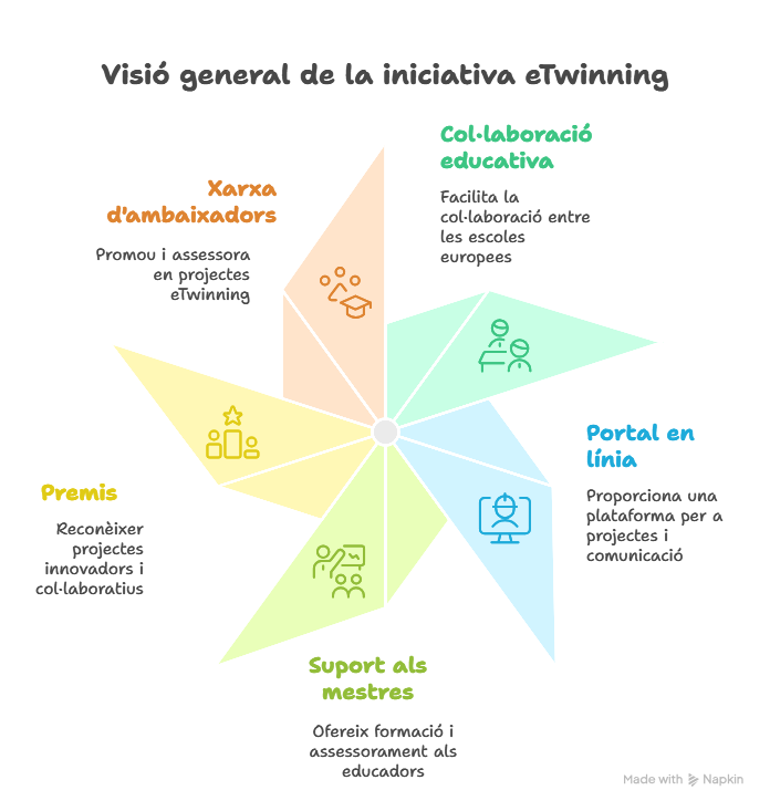 La iniciativa eTwinning promou la col·laboració escolar a Europa utilitzant les tecnologies per a l’aprenentatge i el coneixement (TAC) i dona suport als centres oferint-los les eines i els serveis necessaris que facilitin la seva associació per desenvolupar un projecte en comú.