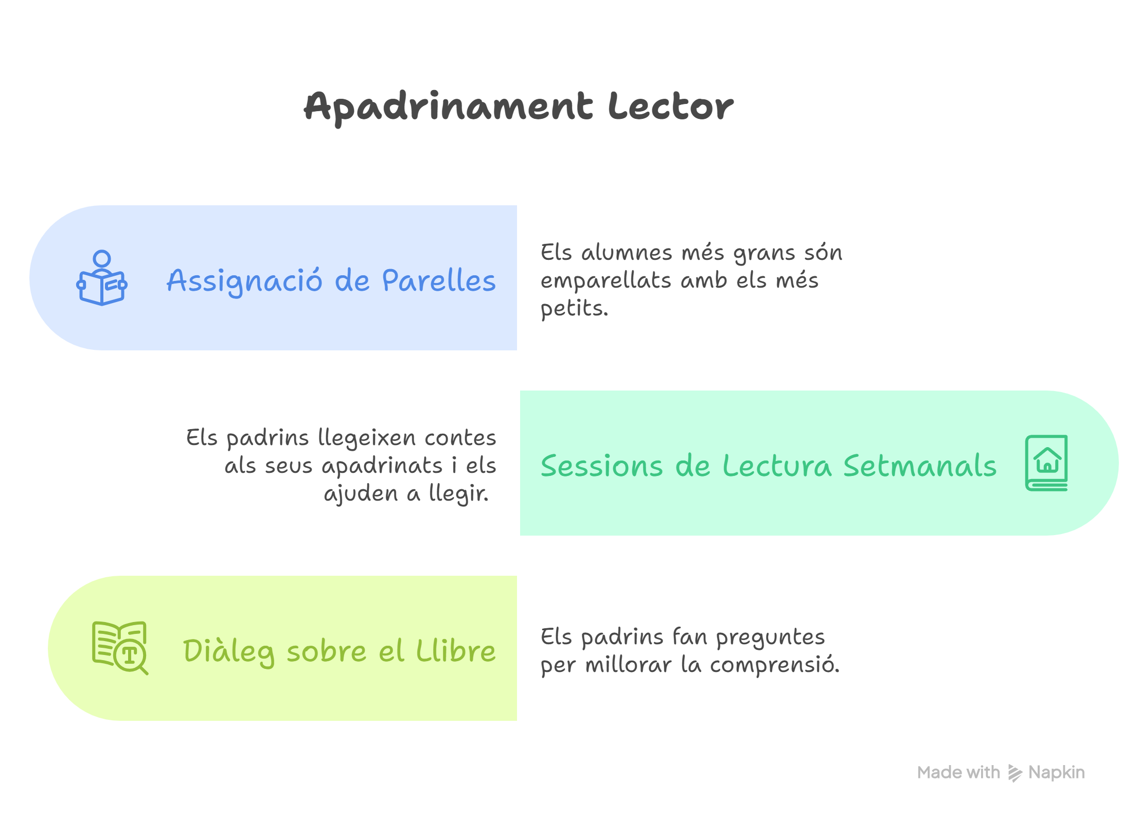 L’apadrinament lector és una activitat en què els alumnes de 3r cicle fan de padrins de lectura per als alumnes de 1r cicle i infantil. Cada padrí acompanya el seu apadrinat en el procés d’aprenentatge lector, llegint conjuntament i fomentant l’hàbit lector en un ambient de confiança i motivació.