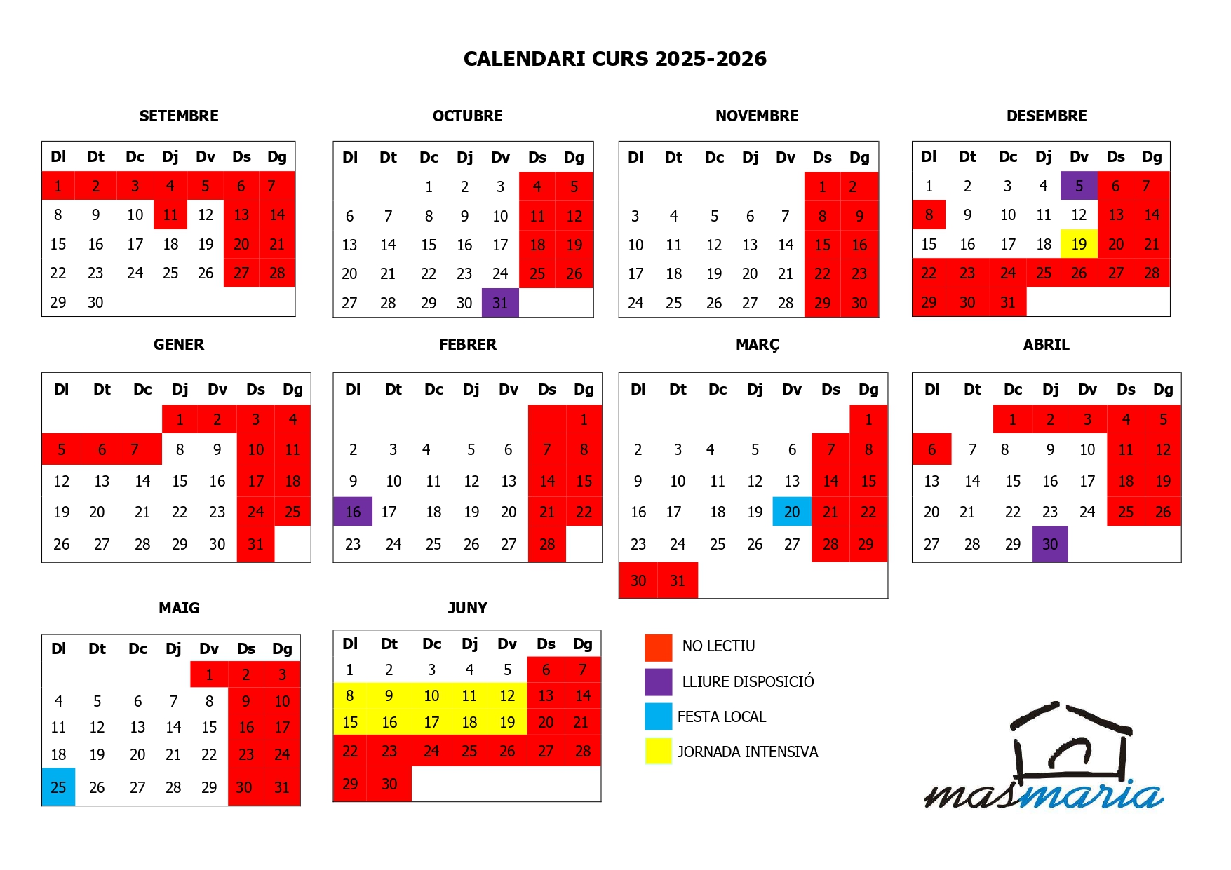L’horari lectiu del centre és de 9:00 a 12:30 h i de 15:00 a 16:30 h per a tots els/les alumnes del centre. El dia 19 de desembre de 2025 i a partir del 8 de juny de 2026 es realitza horari compactat de 9 a 13 h.