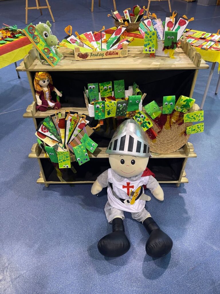 El gimnàs de l’escola s’ha convertit en una sala d’exposicions amb els treballs que han fet els i les alumnes de l’escola. Dracs i punts de llibre dels infants d’educació infantil i acròstics i poemes dels nens i nenes de primària.