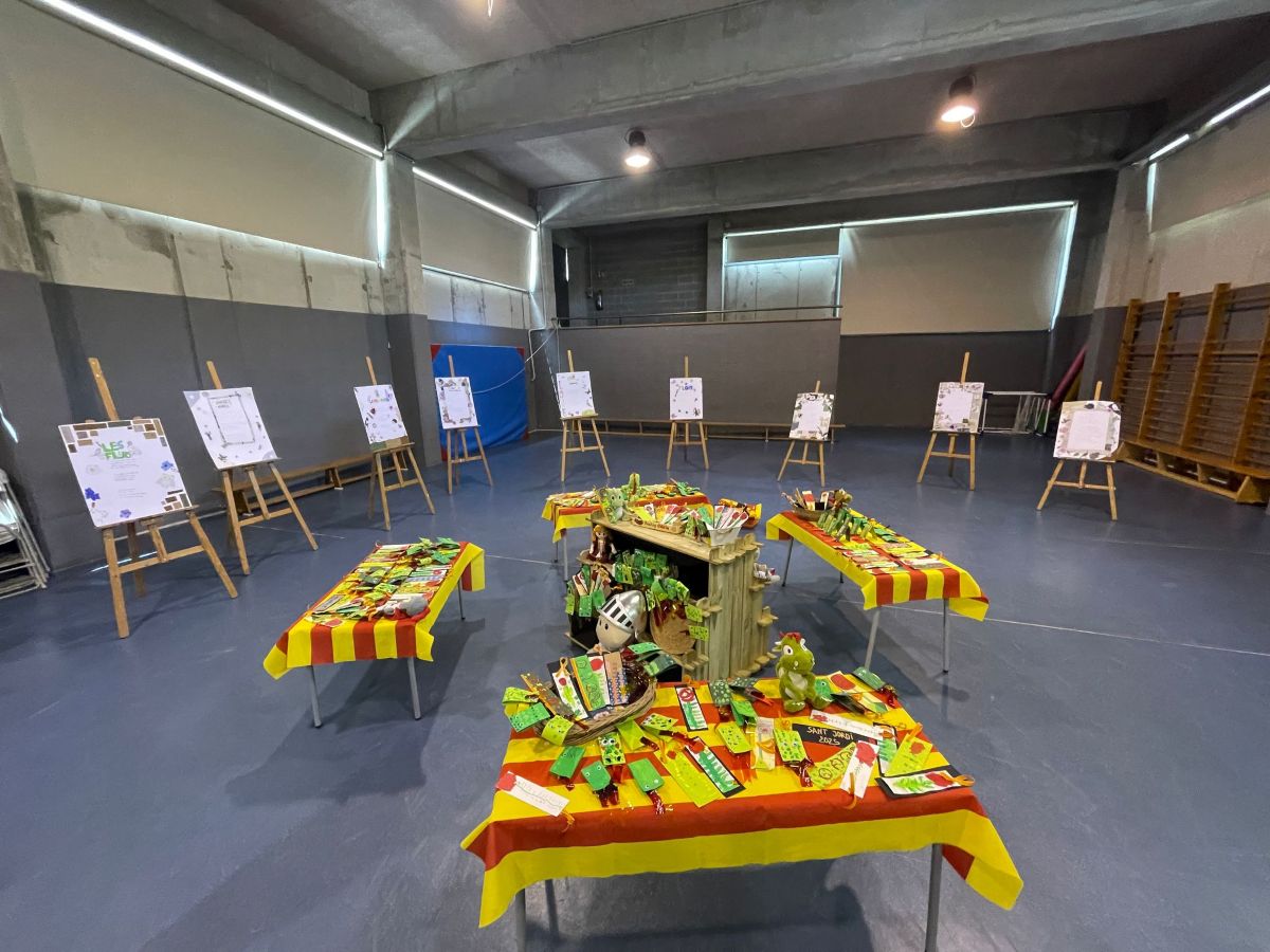 El gimnàs de l’escola s’ha convertit en una sala d’exposicions amb els treballs que han fet els i les alumnes de l’escola. Dracs i punts de llibre dels infants d’educació infantil i acròstics i poemes dels nens i nenes de primària.