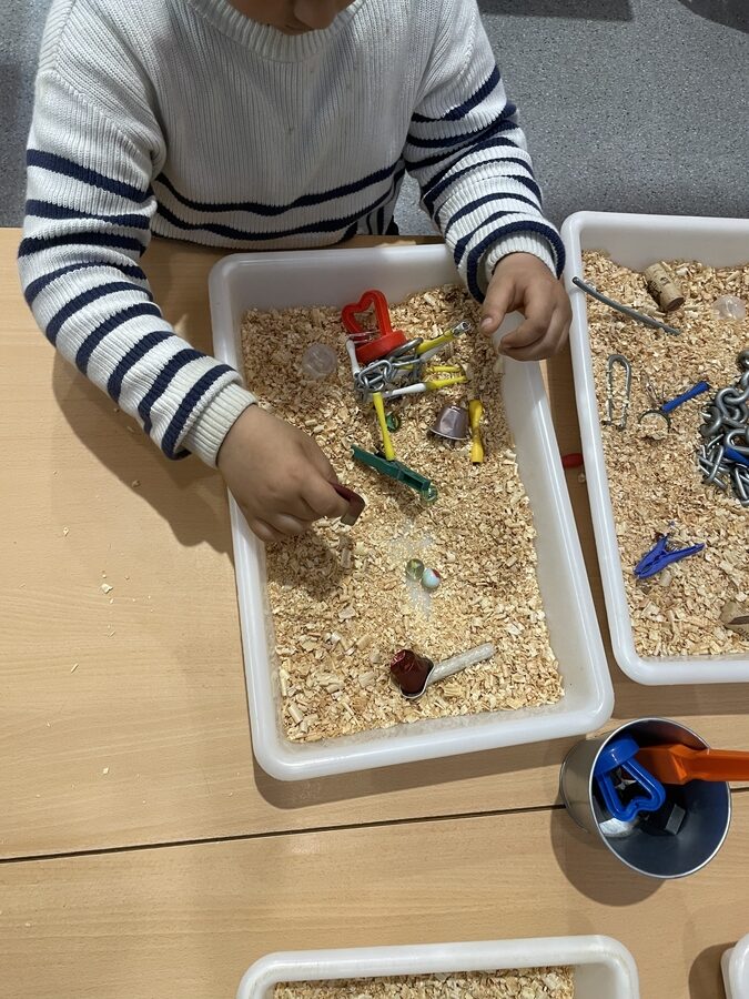 Tres tardes a la setmana, els infants d’I3, I4 i I5 fan espais d’aprenentatge. Es proposen vuit espais diferents: artistes, mira i toca, arquitectes, la calma, mou-te, el vestidor, el petit món i l’espai exterior. En un d’aquests espais, la mestra es comunica amb els infants amb llengua anglesa.